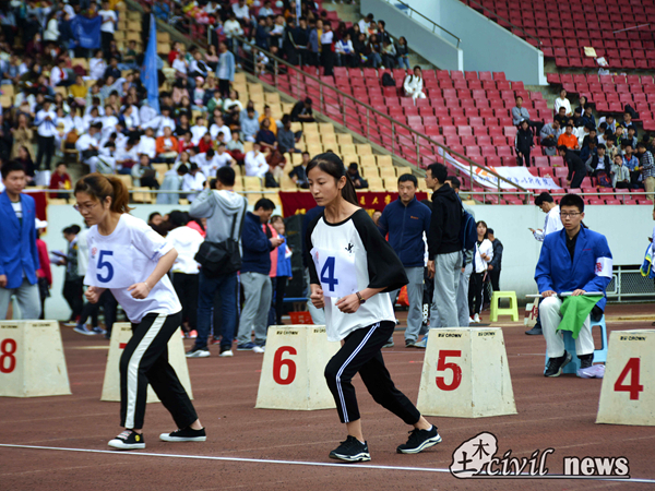 与此同时,企鹅漫步的比赛也在火热进行中。队友之间合作密切,土木学院取得第四名。另一边的女子立定跳远,运动员们急速的助跑,完美的挥臂一跃,稳稳落入沙坑中,马淑萍,杨代琳分别获得第六名和第七名。