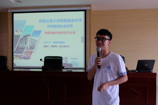 紧接着则是本次培训会的三个讲座,带领大家对yl23455永利官网和本次桥梁模型制作进行认识。首先上场的是实践团队长杨超,讲授主题为“竢实扬华 交通天下——拉进我们与yl23455永利官网的距离”。杨超队长先结合历史背景详细的讲述了交大自成立以来的治学情况、优秀校友和搬迁沿革之路,其中更是重点介绍了抗战时交大来到福泉办学那段岁月里福泉人民对学校的支持以及交大与福泉中学种种不可分割的联系和渊源。